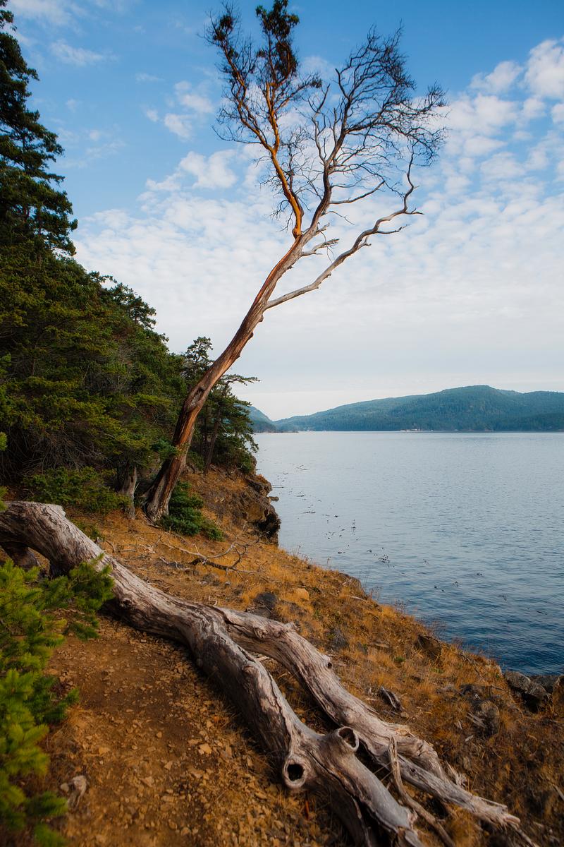Arbutus trees are everywhere in Mayne Island, a beautiful island in the Vancouver Gulf Islands. This image depicts an arbutus that fell after a storm, with a standing arbutus.